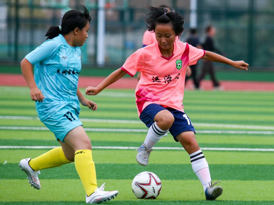 河南省运之杰足球俱乐部球员崔梦洁(右)和来自甘肃省兰州市第十一中学代表队球员沈樱宁在U13女子组比赛中拼抢。新华社记者郎兵兵摄