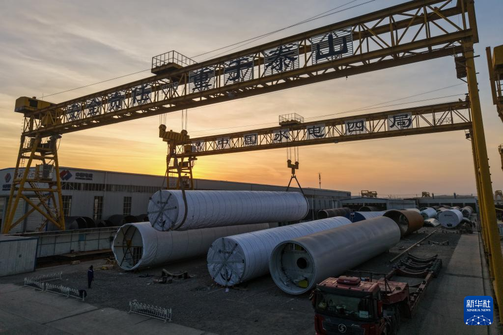 在甘肃省酒泉经济技术开发区的中国水电四局(酒泉)新能源装备有限公司装运生产线上,工作人员进行风机塔筒吊装作业(无人机照片)。新华社记者郎兵兵 摄