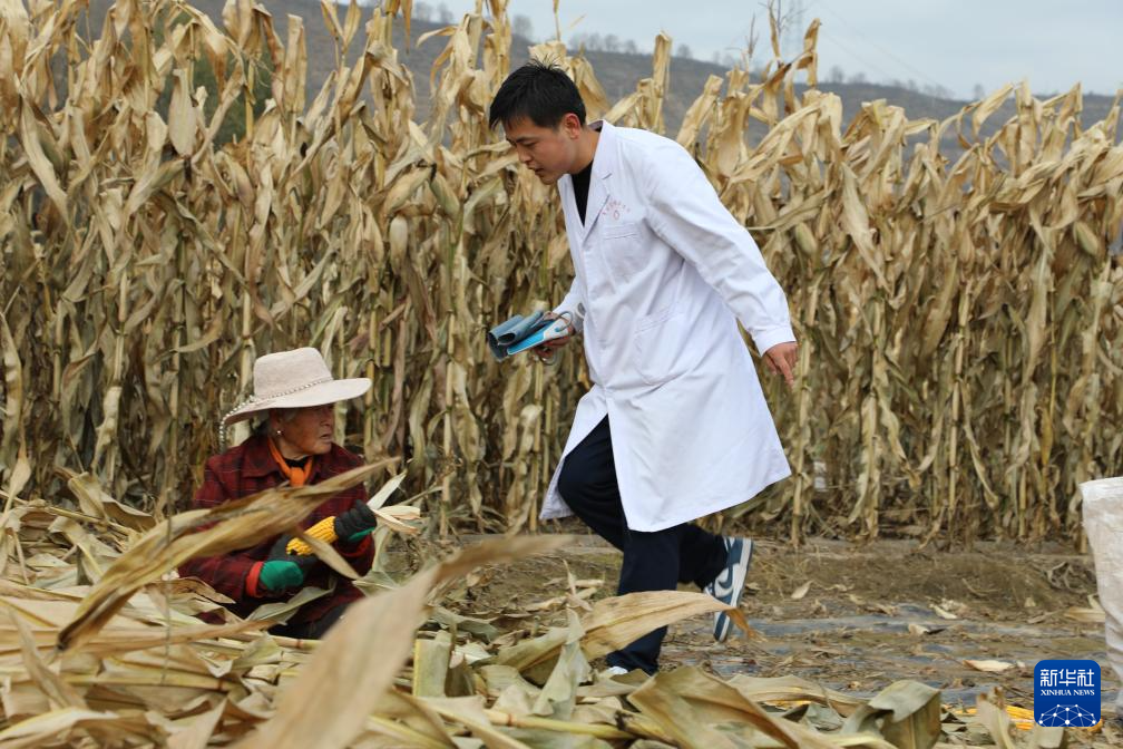 冬日照耀下,一对农家夫妻席地坐在田地里掰玉米。正在走村入户的王鑫,跨步跃上田埂,缓缓走上前,打开行医箱,就地给老乡测量血压。