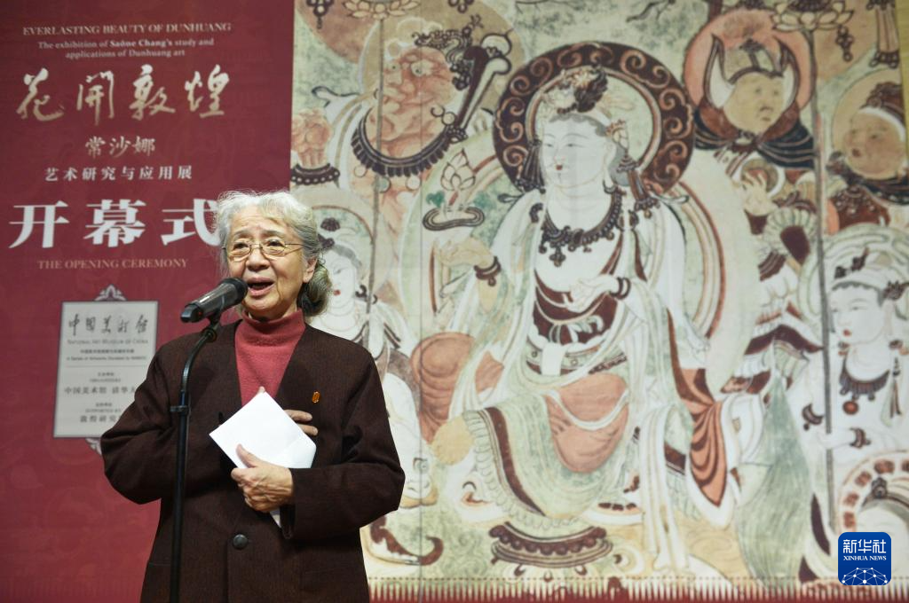 常沙娜在“花开敦煌——常沙娜艺术研究与应用展”开幕式上致辞。新华社记者 鲁鹏 摄
