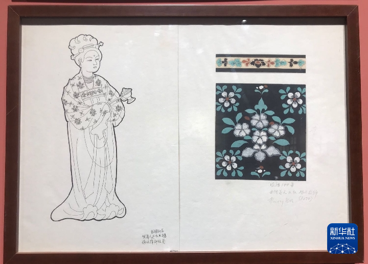 《敦煌历代服饰图案》手稿,红色笔记为常书鸿修改痕迹(资料照片)。新华社记者 张玉洁 摄